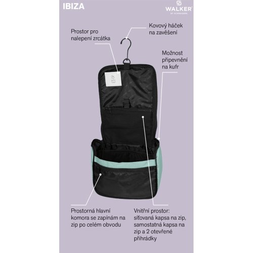 prostor pro nalepení zrcátka pomocí samolepicí etikety a suchého zipu, * kovový háček na zavěšení, * rukojeť pro snadnější přenášení, * možnost připevnění na kufr pomocí zadního popruhu na zip, který lze případně využít také jako další kapsu, * kosmetická taška z voděodolného materiálu Ripstop, * materiál z 50 % z recyklovaného polyesteru vyrobeného z recyklovaných PET lahví, * materiál s impregnací proti vodě a špíně, , Tip: Kosmetickou tašku si můžete barevně sladit s praktickými doplňky jako je kufr, cestovní taška nebo ledvinka.