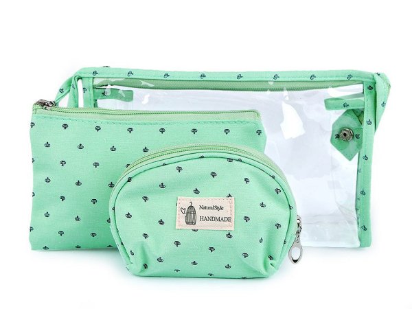 Praktickou sadu kosmetických tašek oceníte při cestování i běžném domácím používání. Sada se skládá ze 3 tašek různých velikostí s designem s drobnými korunami. Zapínání je na zip. Velká taštička - 15 x 25 x 7 cm - je průhledná, má praktické poutko na pověšení, na druhé straně můžete konec zipu připnout na cvoček. Tašku si tak můžete připnout k poutku uvnitř zavazadla, což může zabránit její ztrátě. Prostřední textilní taštička - 13 x 19 x 1 cm - má uvnitř podšívku, malá textilní taštička - 11 x 14 x 3 cm - má také podšívku.