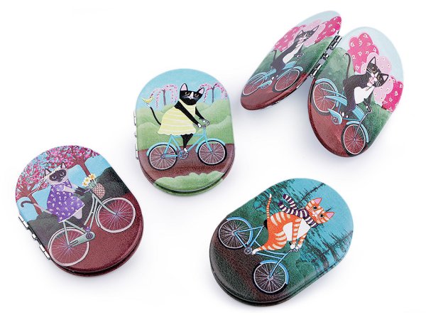 Otevírací zrcátko s potiskem kočky na bicyklu se hodí pro opravu make-upu kdykoliv během dne. Má kvalitní zpracování, je potažené eko kůží. Uvnitř jsou 2 zrcátka, jedno je zvětšovací. Náš tip: zrcátko bude krásným malým dárkem pro kamarádku.