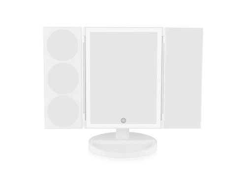 Kosmetické zrcátko s LED páskovým osvětlením, které vám umožní vytvořit dokonalé světlo a nastavitelnou základnou, která se nakloní přesně do požadovaného úhlu. Nezbytný nástroj pro aplikaci make-upu, holení, úpravu obočí či aplikaci kontaktních čoček. Flexibilní design s trojitým složením lze úhledně složit, aby se ušetřilo místo na toaletním stolku.