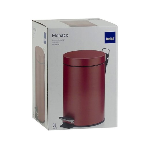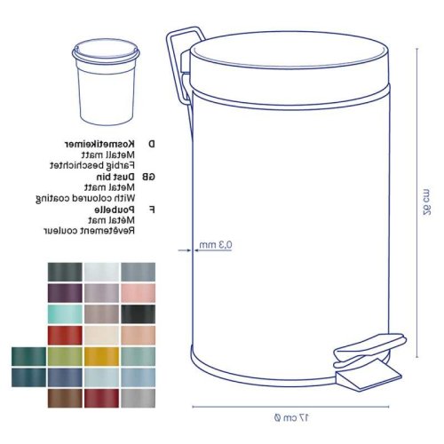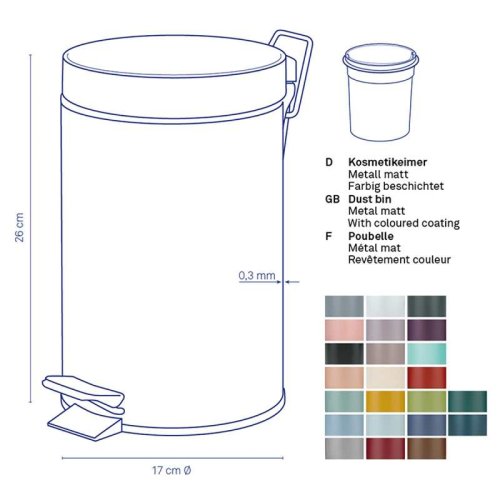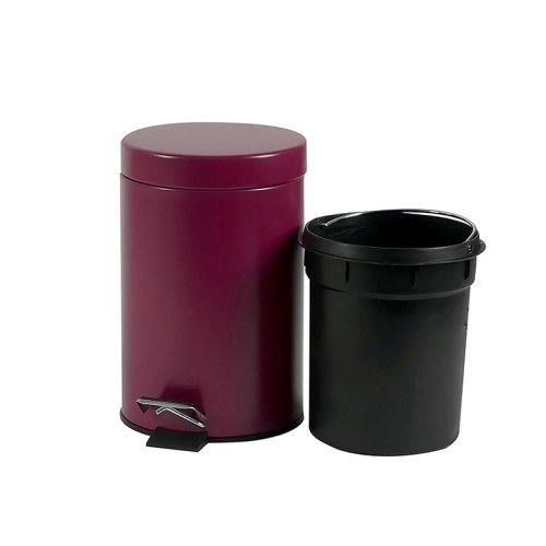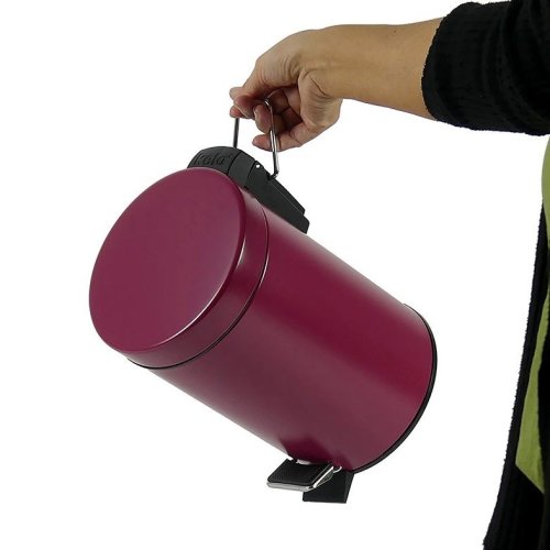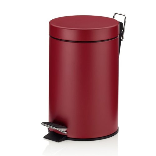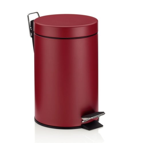 Na menší odpad v kuchyni a koupelně: kovový šlapací koš s matným povrchem. Vnitřní vědro je vyrobeno z černého plastu a má rukojeť. Odpadkový koš je vysoký 26 cm a má průměr 17 cm. objem 3l. Barevná varianta: malinová červená. Kov matný práškový lak 3L, 17cm , 26cm v