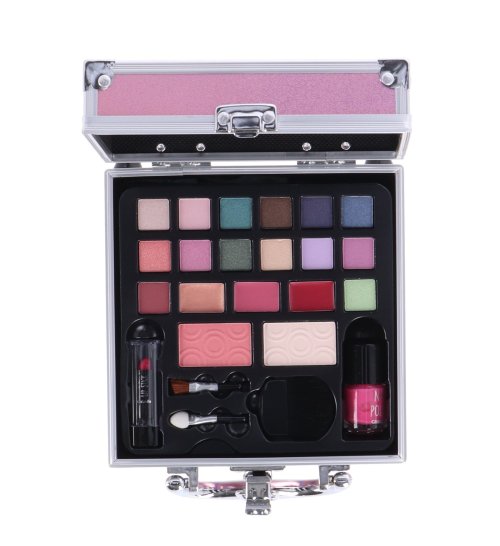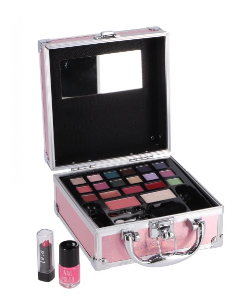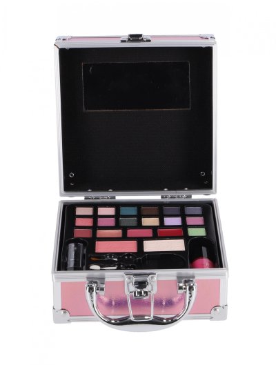 Oční stíny, tvářenku, rozjasňovač, rtěnku, lak na nehty, štětečky, lesky na rty a zrcátko.
