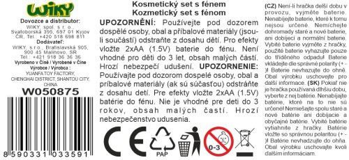 Kosmetický set s fénem. Velikost 21cm. Obsahuje kartáč na vlasy, fén, sprej. Baterie 2xAA nejsou součástí. Funkční fén. Fén se zapíná tlačítkem.