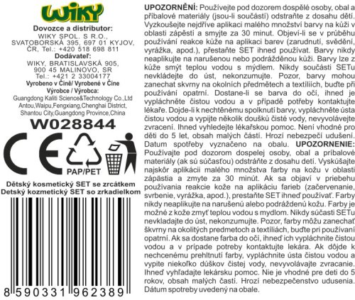 Kosmetický set se zrcátkem. Set obsahuje tvářenku, oční stíny, lesk na rty, aplikátory, zrcátko.
