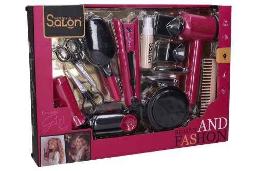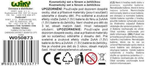 Kosmetický set s fénem a žehličkou – perfektní doplněk ideální pro malé stylistky a parádnice. Set obsahuje fén, žehličku, kartáč, hřeben, 2x nůžky, 2x sponku, sprej a nástavce. Fén funguje na 2x AA baterie (nejsou součástí), žehlička na 2x AAA baterie (nejsou součástí). Rozměry balení: 46,5 x 7 x 33 cm. Věk: 3+