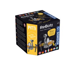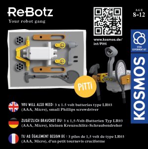 KOSMOS Robot Pitti chodící. 3xAAA baterie nejsou součástí. Obsahuje dílky ke složení robota, nálepky. Doporučený věk 8-12 let. Český návod ke stáhnutí v digitální podobě-QR kód na krabici a v návodu.