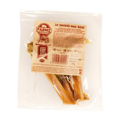 Uzené vepřové kosti – mini - doplňkové krmivo pro psy. Složení: Vepřové kosti. Analytické složky: Hrubý protein 37 %, obsah tuku 14 %, hrubý popel 30 %, vlhkost 19 %. Krmný návod: Podávejte pouze pod dohledem, slouží jako doplnění běžné krmné dávky. Není určeno pro štěňata do 9 měsíců věku. Zajistěte psovi dostatek pitné vody.