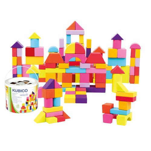 Kostky jasných atraktivních barev a různých tvarů v praktickém kyblíku z kartonu. Víko kyblíku promění balení v hravou vkládačku, může tak dále rozvíjet rozpoznávání tvarů a jemnou motoriku. Hlavní vlastnosti:vkládačka se 100 kostkamipraktické balení