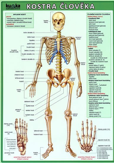 Detailní anatomické nákresy kosterní soustavy člověka. Pomůcka vhodná pro studenty základních i středních škol. Titul obsahuje základní členění kostry člověka. Vhodný doplněk k přehledu přírodopisu. Ilustrace Tereza Budilová .