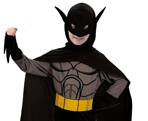 Součástí kostýmu je také černý plášť s kapucí, který je navržen tak, aby připomínal netopýří křídla, což dodává celému obleku dynamiku a autentický superhrdinský dojem. Kapuce je vybavena maskou s průhledy pro oči a dvěma výraznými špičatými ušními výstupky, které charakterizují Batmana. Masku je možné pohodlně nasadit, čímž se dítě snadno promění ve svého oblíbeného hrdinu.