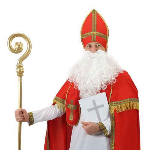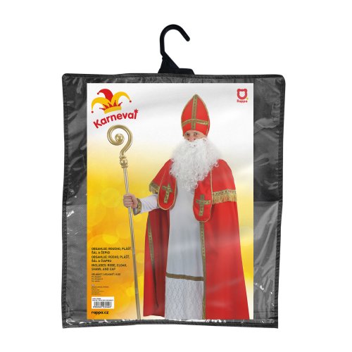 Exkluzivní karnevalový kostým Mikuláše pro dospělé. Kostým obsahuje mikulášskou čepici, dlouhé bíle roucho, červený plášť s límečkem a šerpu s křížem. Neobsahuje hůl ani vousy! Délka bílého roucha od ramen dolů je cca 140 cm.