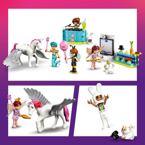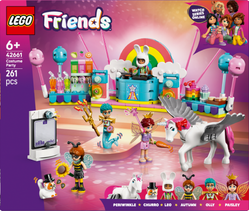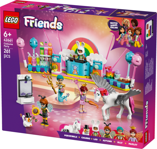 Stavebnice LEGO® Friends (42661) Kostýmová párty s jednorožcem a vílou pro holky a kluky od 6 let obsahuje 4 minipanenky LEGO Friends, figurku kočky a figurku koně a nechybí spousta roztomilých párty doplňků, které inspirují k zábavnému hraní. Děti si vymyslí vlastní zábavné příběhy a zahrají si na společenské situace s kamarády, kteří si zkoušejí kostýmy. Autumn je převlečená za čmeláka a Olly má kostým mořského muže. Připojí se k nim i kocour Churro v kostýmu kouzelníka a Leo v kostýmu králíčka. Paisley má na sobě kostým víly a kůň Periwinkle se promění v jednorožce. Kamarádi si užijí párty s pódiem, djským koutkem a občerstvením. Nechybí fotokoutek se zábavnými doplňky, kde kamarádi nafotí zábavné fotky! Objevte další skvělé hračky a dárky ze světa LEGO Friends (prodávají se samostatně). Tato stavebnice je kompatibilní s aplikací LEGO Builder, která přináší intuitivní stavitelské dobrodružství. V ní můžou děti přibližovat a otáčet modely a sledovat svůj postup při stavění.