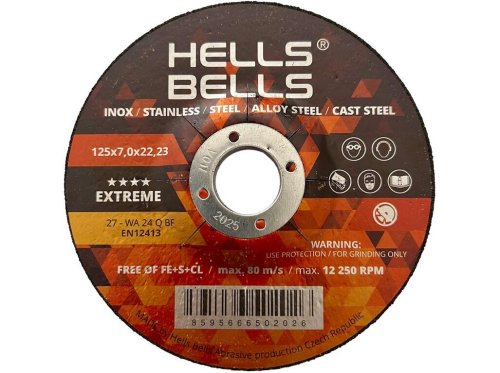 Brusné kotouče Hells Bells s bakelitovým pojivem jsou vyrobeny z prémiového korundového zrna, které je zárukou agresivního brusu a dlouhé životnosti. Neobsahují stopy železa, chlóru a síry. Jsou určeny pro broušení uhlíkových ocelí, konstrukčních ocelí a nerezových ocelí.