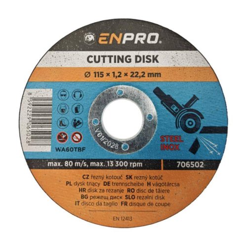 druh zrna: korund pojivo: syntetická pryskyřice na bázi aldehydu pro zvýšení pevnosti armováno dvouvrstvou sklotextilní vložkou max. pracovní rychlost: 80 m/s průměr otvoru: 22,2 mm