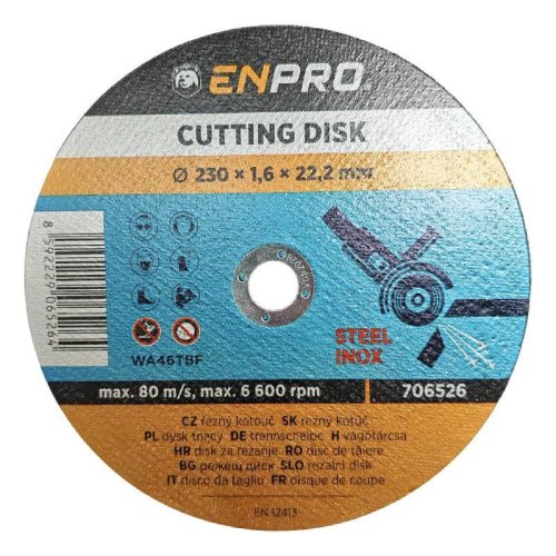 druh zrna: korund pojivo: syntetická pryskyřice na bázi aldehydu pro zvýšení pevnosti armováno dvouvrstvou sklotextilní vložkou max. pracovní rychlost: 80 m/s průměr otvoru: 22,2 mm
