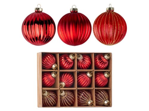 Sada 12 skleněných koulí na vánoční stromeček o průměru 40 mm. Koule jsou dodávány v barevném mixu – čirá s glitrem a červená, což vytváří výrazný a zároveň elegantní kontrast.