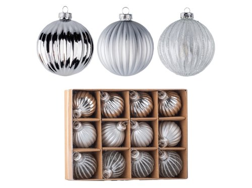 Sada 12 skleněných koulí na vánoční stromeček o průměru 40 mm. Koule jsou dodávány v barevném mixu – čirá s glitrem, stříbrná a šedá, což vytváří elegantní a harmonický vzhled.