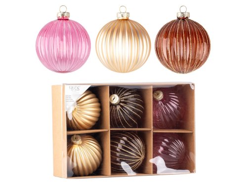 Sada 6 skleněných koulí na vánoční stromeček o průměru 60 mm. Koule jsou dodávány v barevném mixu – čirá s glitrem, růžová, zlatá a bronzová, které společně vytvářejí jemný a elegantní vzhled.