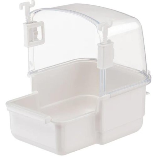 ideální pro andulky a jiné menší exotické ptáky, pro osvěžení a vyčištění peří, bezpečný netoxický plast, protiskluzové dno, ochrana proti stříkající vodě a bidýlko, nastavitelná výška umožňující variabilní uchycení.