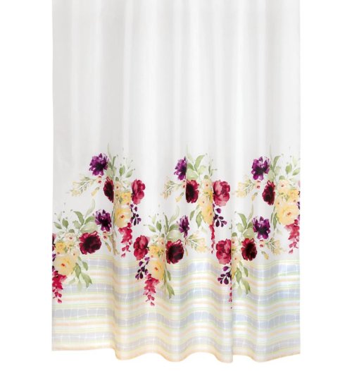 Koupelnový závěs materiál 100% Polyester délka 200 cm praní na 30°C mírný postup nesušit v sušičce žehlit maximálně na 110°C na horní straně otvory pro háčky součástí výrobku 12 háčků na zavěšení