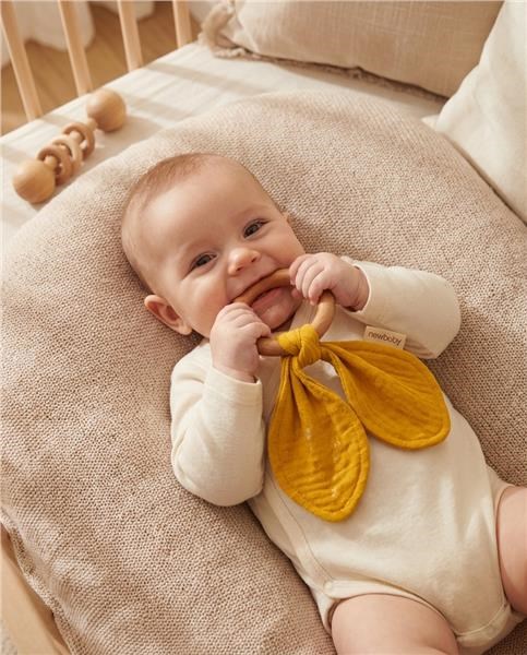 Kousátko ouška New Baby Ears mustard. 100% organická bavlna.100% bukové dřevo. Celková délka: 14,5x10 cm. Rozměry kroužku: 7 cm.