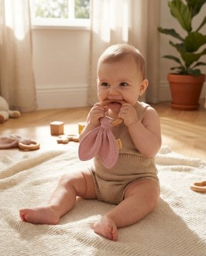Kousátko ouška New Baby Ears pink. 100% organická bavlna.100% bukové dřevo. Celková délka: 14,5x10 cm. Rozměry kroužku: 7 cm.