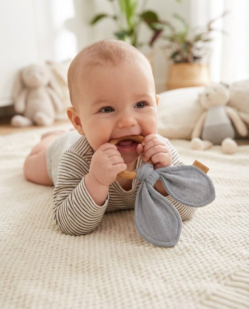 Kousátko s mušelínovou plenou je ideální sada, když se dítěti prořezávají zoubky. Kousátko je vyrobeno z bukového dřeva šetrného ke středu a měkké mušelínové látky. Zcela bezpečné pro děti přináší uklidňující úlevu při prořezávání zoubků. Kousátko lze použít také jako hračku pro miminka. Kousátko se dokonale hodí k našim dalším mušelínovým výrobkům a vytváří tak krásnou sadu, kterou lze darovat na dětskou oslavu.