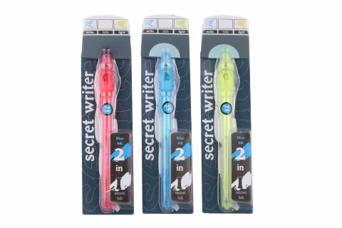 Kouzelné oboustranné pero. Na jedné straně pero s mizejícím inkoustem, který je poté viditelný pouze pod speciální baterkou na konci tužky. Na druhé straně obyčejná propiska. Výrobek je na 3 baterie AG10, které jsou součástí balení. Rozměry balení cca 23 x 6,5 x 1,5x cm. Délka pera cca 15 cm. Výrobek není hračka