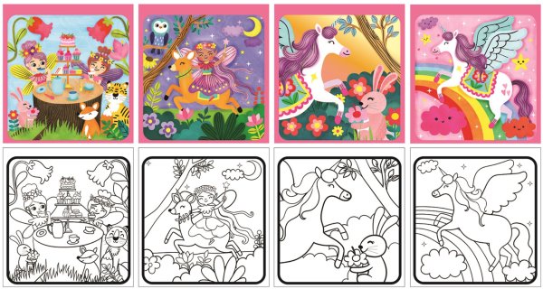 Omalovánky disponují čtyřmi obrázky s motivem jednorožců a víl