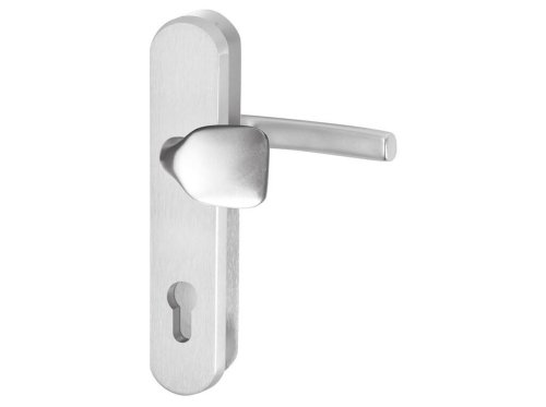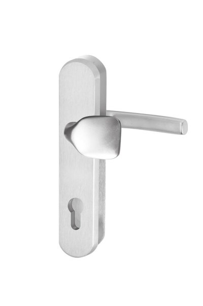 Hliníkové bezpečnostní kování - madlo / klika bez překrytí vložky. Certifikováno v bezpečnostní třídě RC3 dle ČSN EN 1627:2012. Certifikát NBÚ typ 2 SS4=2. Masivní hliníkové bezpečnostní kování v povrchové úpravě F1 - stříbrný elox. PZ - bez překrytí vložky rozetou.