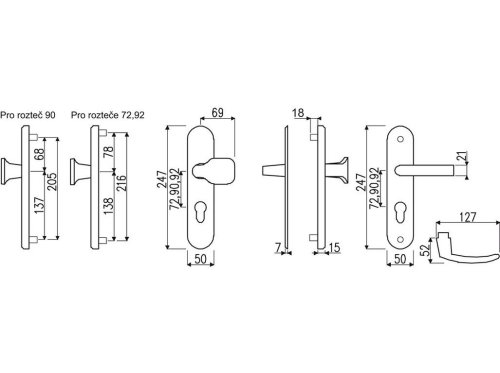 hmotnost netto: R.101.PZ.TB3 - 1,03 kg rozteč: 90 mm tloušťka dveří: 40 - 55 mm