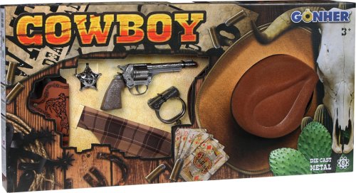 Kovbojská sada velká – obsahuje kožené pouzdro na revolver, šátek, klobouk, pouta, šerifská hvězda, pásek a bohatě gravírovaný stříbrný revolver. Revolver je osmiranný. Věk: 3+
