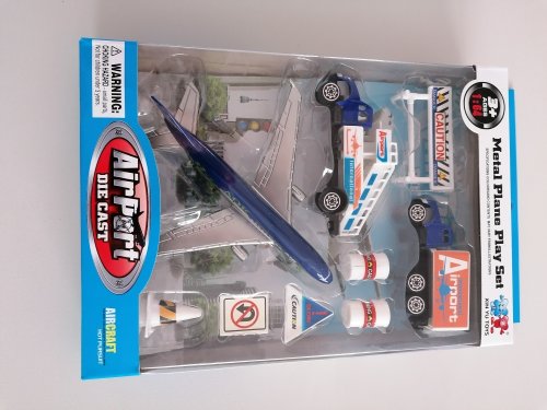 Kovové letadlo s doplňky obsahuje letištní vozidla, značení..