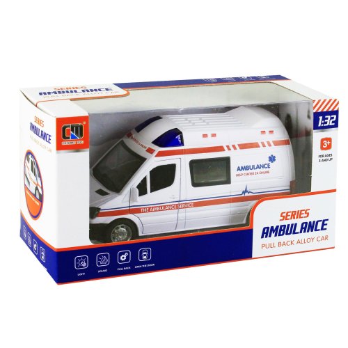 Kovová sanitka po zmáčknutí svítí a vydává zvuk. Boční i zadní dveře se dají otevřít. Funguje na 3 x 1.5 V AG13 baterie.