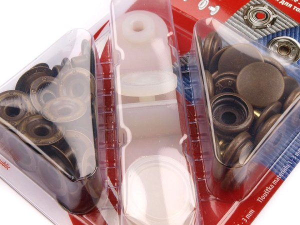 Stiskací knoflíky využijete ke spojování silnějších látek. Nýtování se provádí plastovým mini lisem, který je součástí balení. Návod na nýtování viz obrázek. [Vhodné na tloušťku materiálu 1 - 3 mm.]