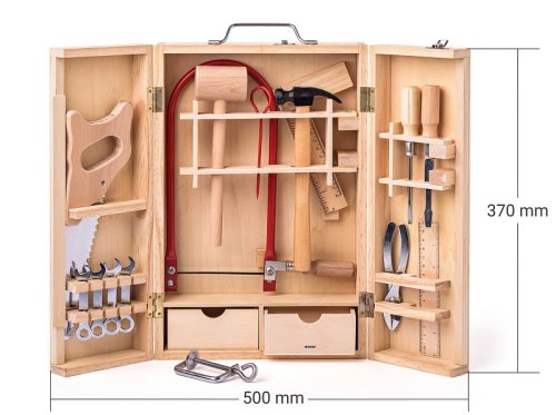Kovové nářadí je reálnou kopií skutečného nářadí pro dospělé. Praktický dřevěný kufřík s panty, v němž je nářadí umístěno, je opatřen kovovými přezkami a uchem pro možnost přenášení. Uvnitř kufříku jsou instalovány západky a speciální otvory, které zajistí jednotlivé kusy nářadí tak, aby při manipulaci nevypadly. Sada obsahuje 26 ks nářadí. | Věk: 5+ | Rozměr otevřeného kufříku: 50x5,5x37 cm