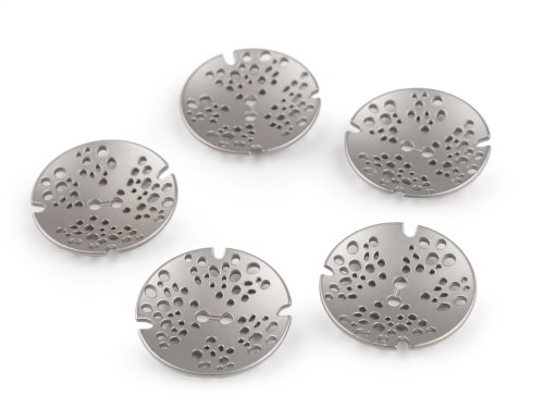 Kovové knoflíky s děrovaným designem vyniknou na kabátech, sakách, bundách nebo kardiganech. Jsou kvalitní, lehce vypouklé a na oděvech upoutají pozornost. Velikost knoflíků naleznete v této tabulce.
