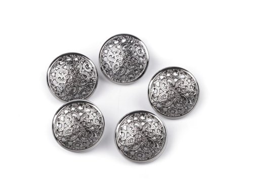 Kovové knoflíky zdobí filigránový vzor. Jsou vyrobené ze slitiny zinku a nemagnetických kovů. Mají spodní přišívání. Knoflíky podtrhnou eleganci kabátů, sak, košil apod. Vyniknou také na doplňcích jako jsou kabelky, tašky nebo klobouky. [Knoflíky jsou baleny v sáčku.]Velikost knoflíků naleznete v této tabulce. [Zinek chrání kov proti korozi. Pozinkované výrobky po vyprání zůstávají beze změn.]