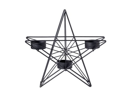 Tento kovový svícen ve tvaru hvězdy o rozměru 220 × 65 × 220 mm pojme tři čajové svíčky. Černé provedení dodává interiéru moderní vzhled a svícen vytváří útulnou atmosféru. Stabilní konstrukce zajišťuje bezpečné umístění svíček a možnost variabilního aranžmá.