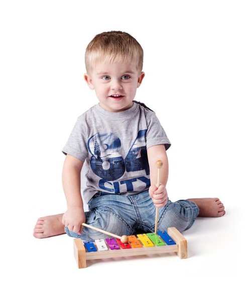 Xylofon patří mezi bicí nástroje. Jeho kovové plátky jsou usazeny na filcových kroužcích, které regulují ostrost zvuku. Dřevěný rám i paličky propůjčují zvuku hloubku a sametovový tón. Věk: 3+ | Rozměr: 25,5 cm
