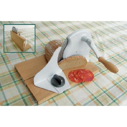 Český výrobce Kvalitní ruční kráječ na chléb. Nerezový nůž průměru 17 cm originál Solingen. Délka dřevěného podstavce je 30 cm, šířka 21 cm. Tloušťku plátků lze regulovat v rozmězí 0 až 18 mm. Vhodné pro styk s potravinami. Třmeny pro zajištění polohy na stole. Vyrobeno ze slitiny kovů s povrchovou úpravou komaxit. Sklopná dřevěná pracovní deska. Barva kráječe bílá, černá, červená nebo zelená dle aktuální skladové nabídky. Koncovka kovové rukojeti je vyroben ze dřeva nebo kvalitního plastu, dle aktuální skladové nabídky. EAN 8590280081018