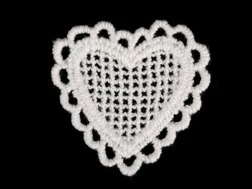 Textilní aplikace srdíčko má rozměry 45 x 45 mm. Okraje tvoří ozdobné oblouky. Používá se ke zdobení oděvů, bytových doplňků, na scrapbooking a dalších dekorací např. vlastní tvorby.