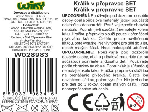 Králík v přepravce. Velikost 28 cm. Součástí je přepravka, plyšový králík a příslušenství: miska, vodítko, hřeben, mrkev. Při zatřesení vydává akustické zvukové efekty.