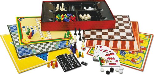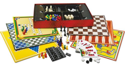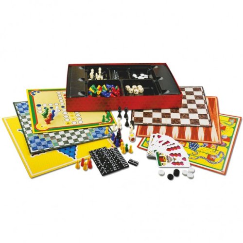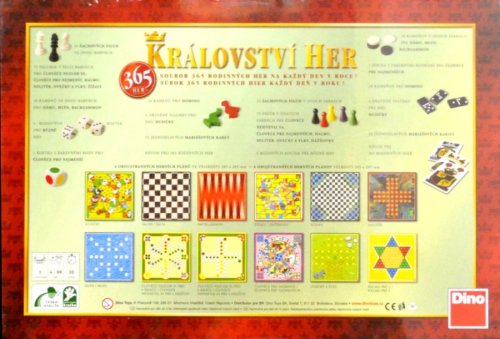 Království her (365 her). Balení obsahuje 6 oboustranných herních plánů, 32 šachových figurek ve 2 barvách, 75 plastových figurek v 6 barvách, 30 dámových kamenů ve 2 barvách, 28 plastových kamenů domina, 4 dřevěné figurky husiček, 32 mariášových karet, 6 bodových hracích kostek, 1 hrací kostku s barvami, 1 pravidla.