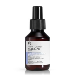 Bezoplachový zpevňující sprej s lehkou texturou s kolagenem, proteinovou molekulou schopnou zahušťovat a dodávat objem jemným vlasům a zvětšovat průměr vlasového stvolu.