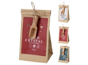Dárková sada s barevnou koupelovou solí v papírovém pytlíčku a dřevěnou lžící.