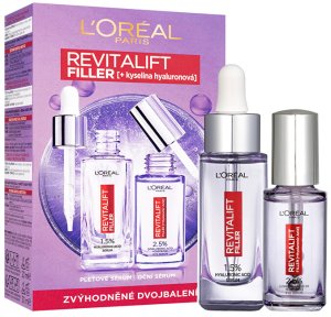 Sada obsahuje: Sérum proti vráskám s 1,5% čisté kyseliny hyaluronové Revitalift Filler (Hyaluronic Acid Serum) 30 ml Oční sérum s 2,5% kyselinou hyaluronovou Revitalift Filler (Eye Serum) 20 ml