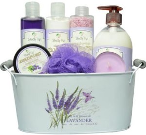 Dárkové balení kosmetiky v dekorativním plechovém obalu s levandulovým olejem.