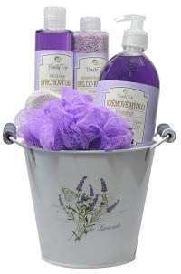 Dárkové balení kosmetiky v dekorativním plechovém obalu s levandulovým olejem.