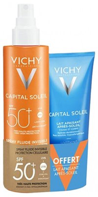 Sada obsahuje: Voděodolný fluidní sprej SPF 50+ Capital Soleil (Water Fluid Spray) 200 ml Zklidňující mléko po opalování pro citlivou pokožku Capital Soleil (Soothing After Sun Milk) 100 ml